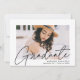 Invités Invitations pour célébrer la remise des diplômes avec nos invitations modernes de la fête de remise des diplômes photo. Les invitations branchés de la fête de remise de diplômes présentent la photo du diplômé avec "Graduate" dans une superposition de script de calligraphie moderne noire. Personnalisez le devant des invitations en ajoutant le nom du diplômé, le nom de l'école et l'année de fin d'études. L'invitation inverse pour afficher les détails de votre fête de remise de diplômes et un motif géométrique pointillé noir et blanc tendance.