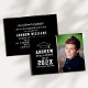 Annoncez votre baccalauréat ou diplômé de l'université en style avec cette faire-part de remise de diplômes et l'invitation de la fête. La carte recto-verso présente un portrait supérieur du diplômé avec un casquette de grade et un design simple et moderne de typographie blanche. L'arrière - plan noir peut être changé en une couleur différente avec la fonction "Customiser", puis Modifier / Arrière - plan pour sélectionner une autre couleur.