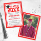 Cette Invitation de la Fête de la Photo Rouge et Blanc est une excellente façon de célébrer le baccalauréat ou le diplôme de l'université. Personnalisez ceci avec le nom, l'école, l'année, les détails de la fête et la photo du diplômé au dos. Cet invitation présente une typographie audacieuse aux couleurs de l'école rouge avec une bordure rouge et blanche.
