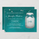 Un pot de maçon hued de luciole d'aqua de turquoise turquoise magnifique de vert bleu couple l'invitation de wedding shower qui les ressembler à lui rougeoie. Ajoutez les initiales et ou le monogramme des jeunes mariés au pot avec une sarcelle d'hiver profonde et une conception de regard de ruban imprimée par blanc. Une frontière vintage subtile de dentelle d'antiquité de damassé complimente cette conception rustique pourtant élégante avec les lucioles enchanteresses intérieures et extérieures du pot. Ces invitations sont beaux pour une partie de douche nuptiale de chute orientée de nuit, de basse-cour, de ferme ou de pays. © Chrissy H. Studios, LLC d'illustration. Tous droits réservés.