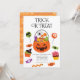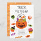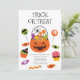 Cette mignonne invitation d'Halloween comporte un jack o'lanterne rempli de bonbons et de cupcakes d'Halloween. Les mots "Trick or Treat" sont écrits dans une police amusante et festive. C'est la meilleure façon d'invitation les enfants de vos amis à une fête d'Halloween éffrayante-douce.