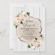 Une tranche de bois rustique avec un spray à fleurs rousses dans l'invitation à la douche nuptiale d'angle. Personnalisez facilement vos informations de fête.