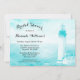 Une invitation à la douche nuptiale à thème nautique avec un décor de phare rustique en bleu et blanc turquoise.