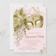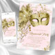 Invitation de fête de mascarade rose et or avec un beau masque à plumes de bijou doré sur un fond bokeh rose élégant et un design de paillettes dorées au verso. Cette belle invitation de fête de mascarade rose et or est facilement personnalisable pour votre événement en ajoutant simplement vos détails dans le style de police, la couleur et le libellé de votre choix. Vous pouvez également changer la couleur de fond.