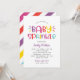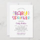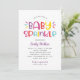 Cette invitation colorée et amusante pour une baby sprinkle présente un lettrage gras "Baby Sprinkle" dans une palette de couleurs arc-en-ciel ludique de rose chaud, violet pourpre, bleu aqua, rouge orangé et jaune vif sur fond blanc croquant. Des rayures diagonales arc-en-ciel ajoutent une touche finale festive et accrocheuse au dos. Tout le texte est entièrement personnalisable pour votre célébration. Un choix parfait pour une fête de baby sprinkle vibrante et moderne pour fille.