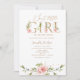Invitation à une fête de naissance avec des fleurs rose doré. Invitation à une fête de naissance avec des lettres dorées florales.