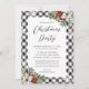 Invitation de buffle noir et blanc avec poinsettia blanches, sainte, baies rouges, flocons de neige et étoiles.