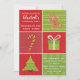 Une mignonne invitation, idéale pour une fête de vacances avec un arrière - plan de différents motifs de fête en vert et rouge, avec des illustrations d'un homme en pain d'épices, d'un sucre de canne, d'un cadeau enveloppé de papier d'emballage de vacances et d'un arbre de Noël. Les motifs arrière - plans ont des rayures vertes, des pois rouges et blancs, des rayures rouges, des flocons de neige et un subtil motif de damas rouges. Customisez le texte pour créer votre invitation amusante à Noël pour vos enfants.