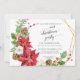 Format horizontal 5x7 | Invitation à la fête de Noël d'hiver. Simple. Moderne. Élégant. Caractéristiques : Serre géométrique avec design floral en forme de croissant. Fleurs de poinsettia rouges mélangées avec des roses sauvages blancs, Holly avec des baies, Mistletoe, cônes de pin et sprigs de feuilles. Droit d'auteur .