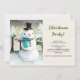 Une invitation à la fête de Noël avec un dessin mignon avec un bonhomme de neige portant un chapeau et un foulard cool. L'arrière - plan a une ligne de pins blancs recouverts de neige.