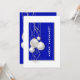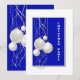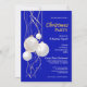 Invitation vos invités avec cette invitation moderne de Noël bleu, blanc et or, avec élégants rubans et baubles d'or et blanc. Cette invitation convient aux fêtes de Noël d'entreprise et de famille.