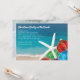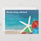 Fête de Noël sur les invitations de plage. Une grosse étoile de mer et des ornements colorés de sapins de Noël ornent cette carte. L'eau de l'océan bleu foncé est l'arrière - plan du texte blanc imprimé. Personnaliser avec le type de partie sur la ligne supérieure. Reverse a éclaboussure l'image des vagues.