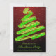 Cette jolie invitation à la fête de Noël montre un arbre abstrait fait dans des lignes ondulées/spirales de néon avec un effet brillant jaune/or, un gradient rouge-noir derrière lui et une faible neige. Il s'agit d'une invitation à fêtes de fêtes festives, lumineuse, moderne, avec un texte entièrement personnalisable. Le dos donne tous les détails du parti en texte vert sur un arrière - plan rayé rouge. Il s'agit d'une élégante invitation à un rassemblement amical ou à une fête d'affaires officielle.