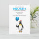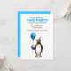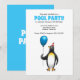 Invitation à la fête de la piscine d'anniversaire de l'été. Il est adapté aux enfants et a une illustration amusante avec un pingouin qui sont prêts pour la fête.