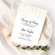 Cette élégante Annonce de Report de Fête de Remise des Cadeaux de Mariage en Confettis Dorés est parfaite pour informer les invités du report de la fête de remise des cadeaux de mariage, de la fête de bébé neutre ou d'autres événements. Le design classique présente des confettis dorés faux sur fond blanc avec une calligraphie simple. Personnalisez l'annonce avec le type d'événement, le nom de l'invité d'honneur et la nouvelle date.