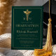 Cette invitation classique et élégante pour une fête de remise de diplôme comporte un caducée doré flanqué de deux lettres de votre choix (par exemple, RN pour infirmière autorisée) sur un fond vert foncé. Personnalisez le texte avec le nom du diplômé, l'école et l'année, ainsi que les détails de la fête. Une bordure rectangulaire dorée encadre le design. Le dos de la carte est vert uni.
