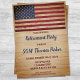 Cartes d'invitation pour fête de retraite militaire avec drapeau américain rustique. Ces invitations de fête avec drapeau américain rustique sont parfaites pour des retraites militaires, des adieux à des soldats, des départs de militaires, des célébrations de retour au pays, et des remises de diplômes militaires. Personnalisez cette invitation avec drapeau américain avec l'événement de votre soldat, son nom et les détails de la fête.