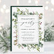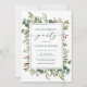 Cette invitation de fiançailles comprend des eucalyptus peints à l'aquarelle, des feuilles verts, des baies rouges, des branches de pin et un cadre rectangle vert avec une calligraphie élégante. Pour une personnalisation plus avancée de cette conception, cliquez sur le lien "Customiser plus loin". Des articles correspondants sont également disponibles.