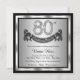 Invitation à la fête des 80 ans argent avec chiffres diamantés et bannière joyeux anniversaire sur fond argent et noir. Cette belle invitation à la fête des 80 ans argent est facilement personnalisable pour votre événement. Vous pouvez changer la couleur de fond. Ce design saisissant convient aussi bien à un homme qu'à une femme. Il s'agit d'un design imprimé sans vrais diamants, argent, paillettes, etc.