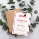 Une invitation moderne et design à la remise des diplômes. Pour lui et elle. Arrière - plan blanc, texte rouge et cadre. Une casquette noire de graduation.