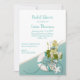 Jolie invitation à la douche nuptiale sur le thème de la plage faite en blanc et en aqua, avec des graphiques de fleurs, d'étoiles de mer et un anneau de sauvetage, décorant en bas à droite. Personnalisez tout le texte pour répondre à vos besoins en événements mariages.