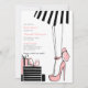Invitation à la douche nuptiale Coquette Bow rose. Feminine fashionista nuptiale invitation douche. Le design présente Blush Rose et Black femelle portant des talons hauts roses avec un gros arc dans le dos. Il y a aussi des cadeaux de photos enveloppés de vaches roses. Des rayures noires et blanches ornent le dos.