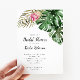 Carte d'invitation à la nuptiale tropicale moderne avec aquarelle illustrant la monstère, la fleur de protéa rose roi et les feuilles de palmiers.