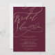 Cette invitation romantique de calligraphie bordeaux à la douche nuptiale est parfaite pour un simple wedding shower. Le design classique moderne comprend des tourbillons fantaisistes et des fleurs fantaisistes avec une magnifique typographie de feuille d'or en faux champagne. Remarque : Ce design ne comporte pas de véritable feuille d'or. C'est un graphisme de haute qualité fait pour ressembler à du papier doré.