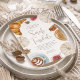 Invitations invités pour un élégant brunch de douche nuptiale automne ou automne avec ces belles invitations aquarelles. Le design présente les détails de votre célébration en lettres modernes, entourés d'illustrations de viennoiseries, croissants, café, figues, citrouilles blancs, cannelle et anis dans les tons chauds de terre.