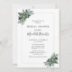 Un aménagement verdoyant de feuilles, fougères et eucalyptus vert émeraude et poussiéreux attire l'attention sur le texte de notre belle invitation à la douche nuptiale. L'arrière de la carte est une teinte verte poussiéreuse que l'on retrouve dans le feuillage du bouquet. Tous les exemples de texte peuvent être facilement révisés avec vos propres détails sur le modèle de personnalisation.
