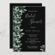 Une invitation branchée à la douche nuptiale en noir et vert. Un arrière - plan noir chic sur le devant. Décoré de sprigs et de feuillage vert botanique. Un grand script à main moderne, typographie avec le texte : Fête des mariées. Modèles pour que la mariée soit le nom et les détails du parti. Texte vert clair. Retour : arrière - plan noir.