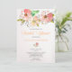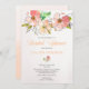 Voici une invitation à la douche nuptiale fleurie, moderne, aérée et gaie. Il présente de belles aquarelles de style impressionniste fleurs et feuillage comme la bordure supérieure sur l'avant. Les couleurs utilisées dans ce design de ligne libre sont le rose corail, la pêche mandarine, le vert jaune chaud et le vert cool. Sous l'image artistique se trouve votre texte personnalisé en gris doux et pastel tangerine. Une seconde image florale miniature assortie sert de séparateur de texte. L'image et le texte sont placés sur un arrière - plan blanc. L'arrière de l'invitation est un subtil dégradé aquarelle laver qui correspond à la couleur de pêche de la mandarine dans les fleurs.