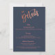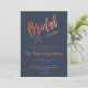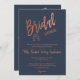 Créez une Fête des mariées personnalisée et splendide, chic et minimaliste pour les futurs mariés. Cette invitation à la douche nuptiale présente un script de calligraphie spacieux et magnifique écrit en feuille d'or rose faux et avec un arrière - plan bleu marine. Vous pouvez facilement le customiser avec votre propre texte et le customiser à votre goût. Veuillez noter : "Bridal" et "-Shower-" et "-The-" "Details" et l'illustration en verre de champagne ne peut pas être modifiée. Remarque supplémentaire : L'impression de feuille d'or rose est un effet de feuille d'or rose faux. Ce n'est PAS la feuille d'or rose d'estampillage à chaud.