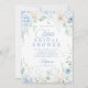 Elégant invitation de douche nuptiale avec hydrangées bleues poussiéreuses et fleurs blanches.