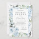 Elégant invitation de douche nuptiale avec hydrangées bleues poussiéreuses et fleurs vertes.