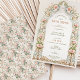Cette invitation à la douche nuptiale magnifiquement conçue dégage un charme et une sophistication victoriennes, avec des motifs floraux complexes avec des roses roses douces, des feuilles verts délicats, et d'élégants défilés dans les tons or. L'avant de la carte met en évidence les détails mariages dans un cadre fleuri orné, créant une atmosphère intemporelle et romantique. L'arrière poursuit le thème élégant avec une répétition motif du design floral d'inspiration vintage. Idéal pour les couples qui projettent une mariage classique, vintage ou sur le thème du jardin, cette invitation donne un ton luxueux à votre journée spéciale, alliant la grâce de l'esthétique victorienne à l'artisanat moderne.