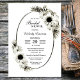 Une élégante invitation à la douche nuptiale à fleurs, noir et blanc, rustique, avec des tournesols et des marguerites disposées sur un cadre ovale.