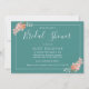 Une jolie invitation à la douche nuptiale avec bouquets aquarelle fleuris en pêche et blues avec un cadre blanc fin, sur un arrière - plan de turquoise poussiéreux. Le texte est dans un blanc contrasté, avec l'expression "Fête des mariées" comme une caractéristique principale dans une police de caractères manuscrite moderne. Le verso de la carte est en pêche.