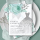 Belle invitation à la douche nuptiale à fleurs d'aqua & argent avec une robe mariage glamour. Retournez notre invitation wedding shower pour voir un dos à floral de coordination pour une touche spéciale supplémentaire