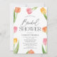Célébrez une douche nuptiale sur le thème du printemps avec ce joli tulipes d'aquarelle modèle d'invitation à la douche nuptiale. Fleurs de tulipe colorées en rose, orange et jaune avec une police de script de calligraphie moderne. Idéal pour une fête de douche nuptiale dans le jardin de printemps.