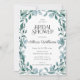 Éléments : aquarelle, cadre complet, verdure, feuille, eucalyptus, typographie serif. Couleurs : vert, bleu, sauge, menthe, aqua & blanc avec typographie noire chaude. Thèmes : jardin, nature, botanique, romantique, plein air, capricieux, feuillage, clair et lumineux, vintage, élégant. Collection : Eucalyptus Verdure Cadre Vert Bleu Bleu Blanc Mariage Suite. Type de produit : Invitation classique - Vertical