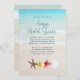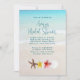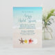 Invitations de douche nuptiale avec un design de plage tropicale. Eau bleu turquoise et sable de plage image est l'arrière - plan de votre choix de texte. Une rangée de fleurs et de coquillages ornent le fond. Le texte est bleu marine.