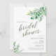 Une élégante invitation à la douche nuptiale avec des eucalyptus à l'aquarelle et des feuilles botaniques avec une calligraphie simple et des polices sans serif classiques.
