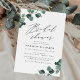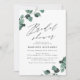 Des invitations branchées et élégantes à la douche nuptiale avec vos détails de douche avec des arrangements d'eucalyptus vert poussiéreux peint à la main et de feuillage aux coins. Personnalisez les invitations à la douche nuptiale d'eucalyptus en ajoutant le nom de la mariée et les détails de la douche. Conçu pour coordonner avec notre collection Moderne Eucalyptus Green.