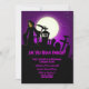 La faucheuse grine dans une cour grave avec une pleine lune et le ciel violet foncé. Invitations amusantes et effrayantes de costumes d'Halloween. Tout le texte est entièrement personnalisable.