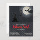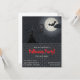 Invitation de fête d'Halloween. Le design montre une araignée dans une toile d'araignée et derrière elle un château éffrayant, une grande lune brillante et un mur en brique contenant tous les détails pour votre fête d'Halloween. Personne ne dira "Non" à une fête d'Halloween avec une invitation comme celle-ci.