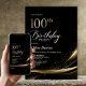 Invitation vos amis et proches à votre 100e anniversaire avec cette invitation moderne en noir et or. La zone de texte personnalisable de ce modèle d'invitation vous permet d'inclure sans effort tous les détails nécessaires à votre fête d'anniversaire, y compris la date, l'heure, le lieu et les informations RSVP. Une variété de types de papier et de styles d'angle sont disponibles pour vos invitations uniques, ainsi que l'option de téléchargement si vous préférez un format numérique.