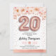 Invitation à la fête du 20e anniversaire. Design élégant en faux or rose parties scintillant avec accent floral. Carte Invitation avec numéro d'or rose 20 ballons, police de script avec confetti. Corail blanc rose, blanc. Parfait pour une célébration anniversaire du XXe siècle. Message-moi si vous avez besoin d'âge personnalisé.