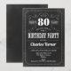 Invitation à la fête du 80e anniversaire. Invitation d'anniversaire d'adulte noir et blanc pour hommes ou femmes. Fonctionne avec un motif de tableau noir et une police de script de typographie rétro. Bravo à 80 ans ! Elégante carte invitation parfaite pour une célébration anniversaire de jalon élégante.