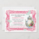 Les invitations à la fête de thé de la mariée du jardin à l'avant présentent un cadre français assez vintage en papillons roses à la menthe et une théière ancienne ornée de roses. Le dos a un motif damassé en rose.